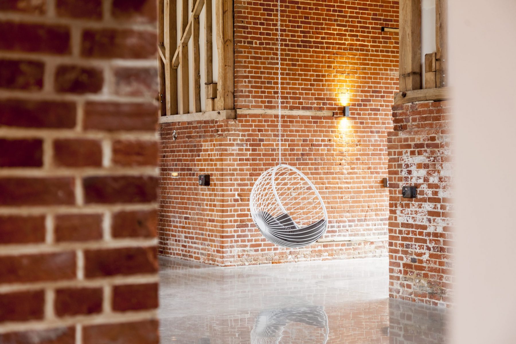 Images : (Upper) Swinging chair in the barn, (Lower) Milking stalls (Photography, Steve Lancefield) / Kevin and David in the barn (Photography, DNA) / (Lower) Church Hill Barn timber structure detail (Photography, The Modern House). Swinging Chair by Ben Rousseau Studio.