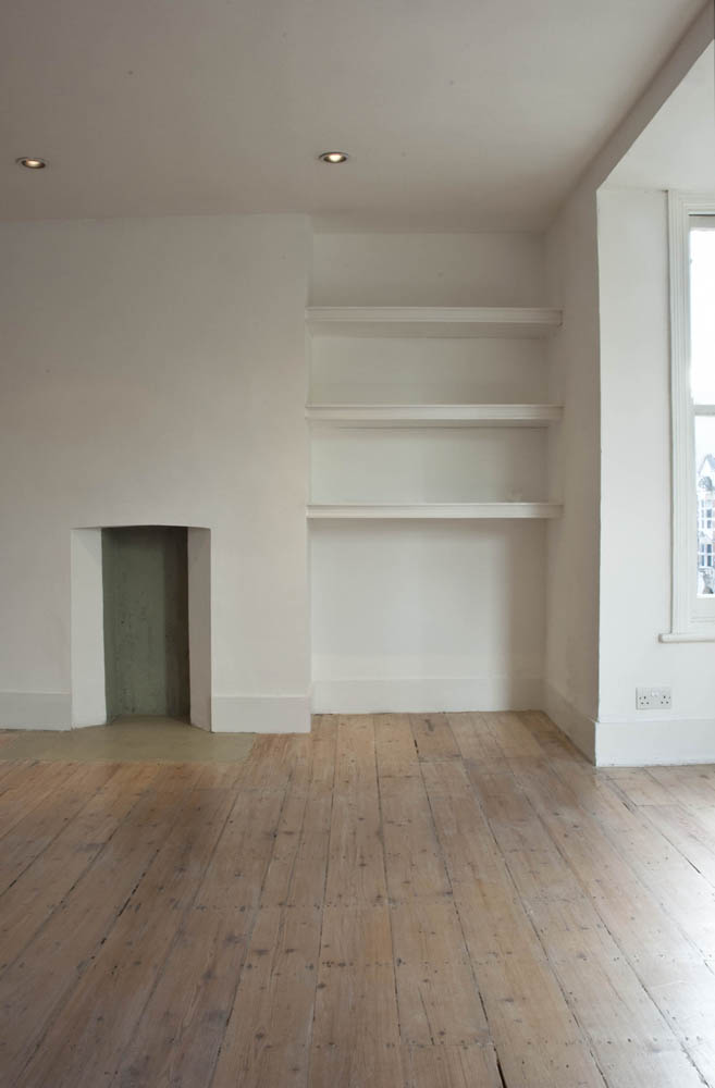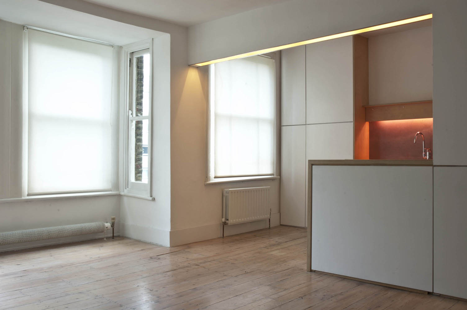 The simple palette of birch joinery, concrete like, fibre-cement wall panels and matt white finished built-in full storage, is appointed throughout the apartment, unifying the spaces. In order to keep costs to a minimum, much of the joinery and finishes were undertaken by the owner.
