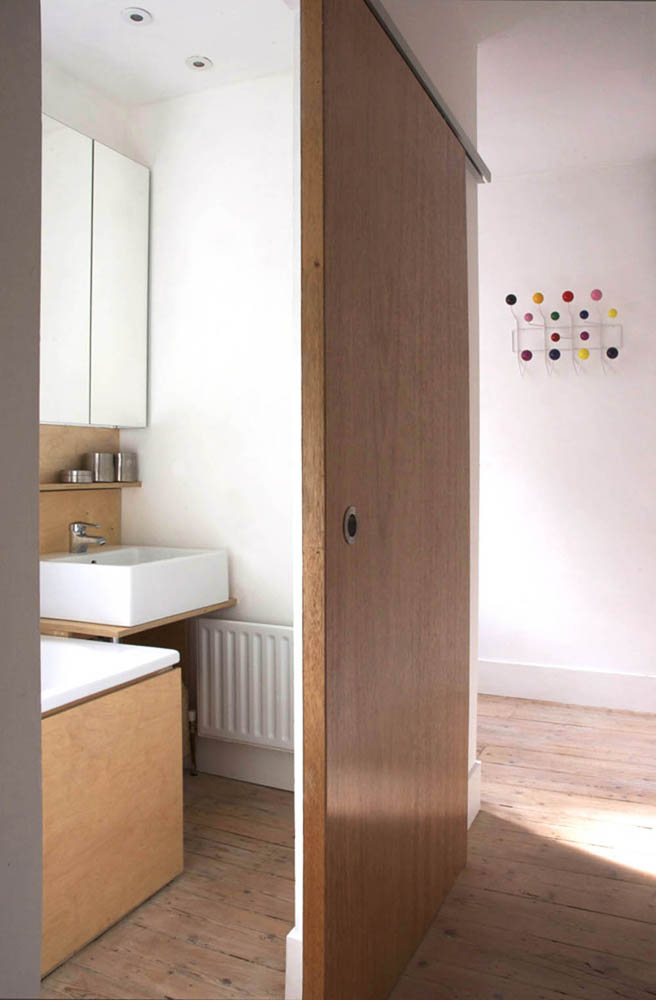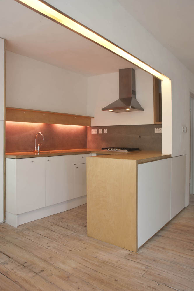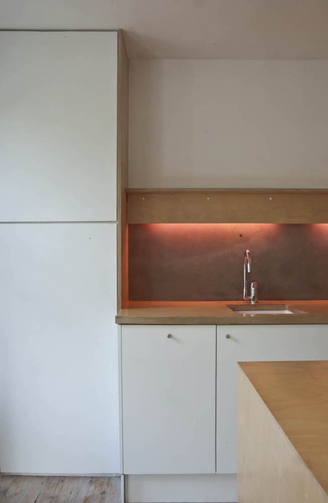 Dimmable lighting concealed within a partition frames the kitchen area which is defined by a freestanding birch clad island worktop. The worktop that folds 90 degrees from horizontal to vertical to articulating the end of the counter. Above the sink is a birch clad storage shelf, with a pink concealed light that picks up the accents of colour variation within the fibre cement splashback. In oredr to keep costs down, readily available components were utilised or appropriated to suit. David was involved closely wih the selection of fixtures and fittings for the project, from door handles to chairs and bathroom fixtures.